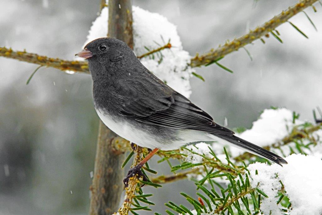 Out the window here at the WRI, snow is back. Dark-eyed juncos are here in number now, which is appropriate because they are also called Snowbirds. They come through in the fall about the time snow begins, and then come back north about when snow is ending. I hope it ends with this snowstorm, although maybe I should take that back because we need moisture in the soil for spring growth and berry production.