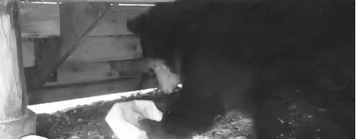 After he removed it, I watched for chewing and swallowing motions, but he turned his head away and I couldn’t see. They usually ingest the foot pads as evidenced by the facts that we find them in their scats and we don’t find them in their dens. But this was an extra big piece of foot pad that he pulled off. Would he swallow such a big piece? I wanted to check. It was gone as is usual. I also wanted to take pictures of his bed and look for any scat that we might have missed being deposited in the videos. None, and no bad smell of any kind. That was at 5 PM to 5:20 PM. I was sure he was gone for good.