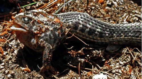 In the escape today, the smaller snake (maybe two feet long) was swallowing the toad feet first and had the legs and part of the body down its throat. The snake moved one side of its mouth forward and then the other on the inflated toad until it ran into the parotoid glands. A few minutes later, the snake worked the toad back out, apparently none the worse for wear.