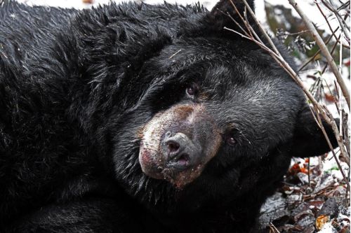 In early afternoon, I stopped by again. He wanted to get up but couldn’t. It seemed the anesthesia drugs were hanging on too long despite administration of a reversal drug. The medical team went into action with an additional shot. Within a half hour, Ted was up, moving into his chalet, and arranging the straw to his liking. He was settling in to his familiar home. He relaxed and rested the rest of the day, making everyone feel relieved that he was back to normal behavior. Tonight, we, too, will sleep well, thankful that Ted is getting good care from Sharon and the Bear Center staff and from his medical team. Local veterinarian Kristin McCarty and her husband Sean had two nearly sleepless nights transporting and attending to his every need after his 6 hours of surgery. More information on that is coming soon.