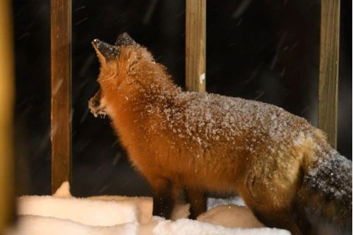 The forecast was for 5 to 8 inches, which includes the depth the red fox is showing, but it is still snowing. Charlie and Jane see this same fox and say it is a female. I’m glad I didn’t try to name her yet. I hadn’t seen her for a couple days and learned she has been at Charlie and Jane’s where they cook and debone chicken and serve it warm. There, the fox often says “No thank you” to bologna. Trying to keep up with the Jones, so to speak, I served a mix of mice, mini blueberry muffins, and rib eye. The fox liked it all and was here twice. I can’t serve rib eye all the time, though.
