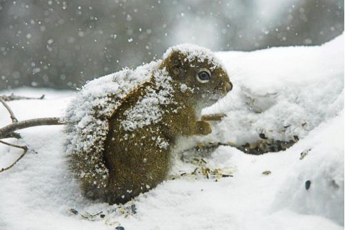 One day it is sunny, making chickadees bright. The next is snowy with squirrel tails acting as umbrellas.