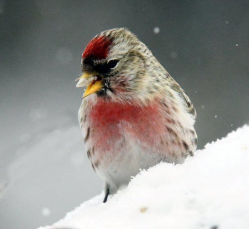 Redpoll maleI still haven’t seen Pretty Girl or the bobcat lately, but this day started with a different treat. Fresh snow covered everything. I went out onto the second floor deck to feed the birds and was greeted by eleven deer gathering below looking up expectantly. Chickadees, nuthatches, and redpolls gathered on a branch above me. I wondered if more than the usual two chickadees would take food from my hand. Nope. Some of the others fluttered close but didn’t dare to land. Then came the surprise.