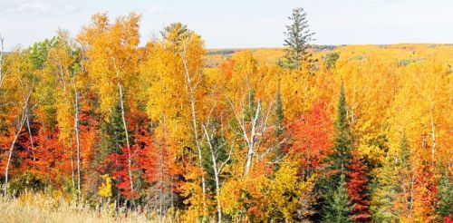 The photo of the fall colors was taken from the nearby overlook two days ago when color was at its peak. Maples are adding their reds while aspens and birches provide the brilliant yellow. In the last couple days a brilliant birch out the window here lost most of its leaves, and maples are beginning to do the same. It will look quite barren around here in a couple weeks.