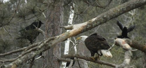Then something happened I’d not seen before. The eagle swooped in for another helping and carried it high in a red pine. Crows gathered as before but were more and bolder—at least 11 of them. One after another, individuals flew to a branch above the eagle and dropped down to touch or land on it. The camera caught bold ones that landed and pecked before leaping away with the eagle mostly ignoring them. The eagle's beak was always either full or busy pecking at the meat held in its talons. The two pictures show both. When the eagle finished its meat and just sat there, the crows gradually flew off a few at a time.