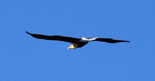 The usual pair of eagles somehow discovered that we put out food for them, too, and one of them settled down in a big pine looking at his or her food waiting below as I was writing this update. The picture (at top) shows how flat their wings are as they glide, making it easy to know it’s an eagle, not one of the turkey vultures that also discover the food pile we put on the ground for them. Vultures glide with their wings angled up in a V.