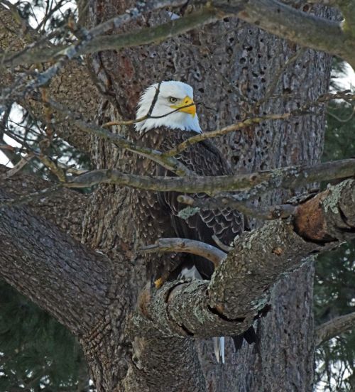 The biggest excitement today was when a pair of eagles swooped by almost touching each other and one of them grabbing leftovers from yesterday’s turkey. But the eagle that grabbed the turkey neck and liver apparently dropped the meat because its talons were empty when it landed in a white pine over on the edge of the yard, letting me take this picture (top). I spotted the liver mostly hidden in the snow but got way-laid by a phone call I had to take. When I was done, the eagle was gone, the liver was gone, and a raven was flying off empty handed. I don’t know what happened. To see if they wanted more, I put a half package of bologna on the eagle’s usual grab and go spot, looked around and saw one of the eagles perched maybe 35 feet away calmly watching what I was doing. To my surprise, the eagle immediately flew toward me, passing over me with its wide wingspan less than ten feet above my head. Exciting. When it landed maybe 60 feet away in a big white pine, I went inside to get a picture from my desk if it came for the bologna, but it eventually just flew away.
