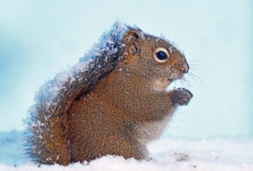 With the temperature well below zero and snowing, this red squirrel did its usual a few days ago. Knowing where the food was supposed to be, it dug down for its share of sunflower seeds, using its tail as an umbrella as it snowed.